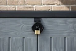 Weet jij niet waar je al jouw tuinspullen op moet slaan? Deze handige opbergbox van het merk Keter biedt de oplossing. De opbergbox heeft een capaciteit van 1200 liter en is daarmee perfect geschikt voor het opbergen van tuingereedschap, kussens, buitenspeelgoed of 2 containers van 240 liter. De weerbestendige constructie zorgt ervoor dat je spullen droog en geventileerd blijven. Voor extra gemak is er een hellende drempel aan de voorkant van de opbergbox gemaakt zodat je de spullen gemakkelijk in en uit de berging kunt halen. Ideaal aan deze opbergbox is dat er zowel vanaf de bovenkant als aan de voorkant toegang tot de berging is. De bovenkant is voorzien van een deksel die gemakkelijk te openen is dankzij de hydraulische veren. Aan de voorkant zitten 2 afsluitbare deuren zodat je ook gemakkelijk je grasmaaier of barbecue er in kunt rijden. Na ontvangst dient de Keter Store-it-out Ace nog gemonteerd te worden. Dit is eenvoudig uit te voeren met behulp van de meegeleverde handleiding.
