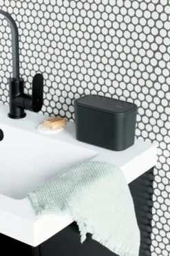 Houd je wastafel schoon en netjes met dit Brabantia MindSet badkamer afvalbakje! Een baby afvalbakje met klapdeksel, ideaal voor het weggooien van wattenstaafjes of pads. Stijlvol, hygiënisch en te bedienen met één hand. Voor een mooi georganiseerde badkamer.