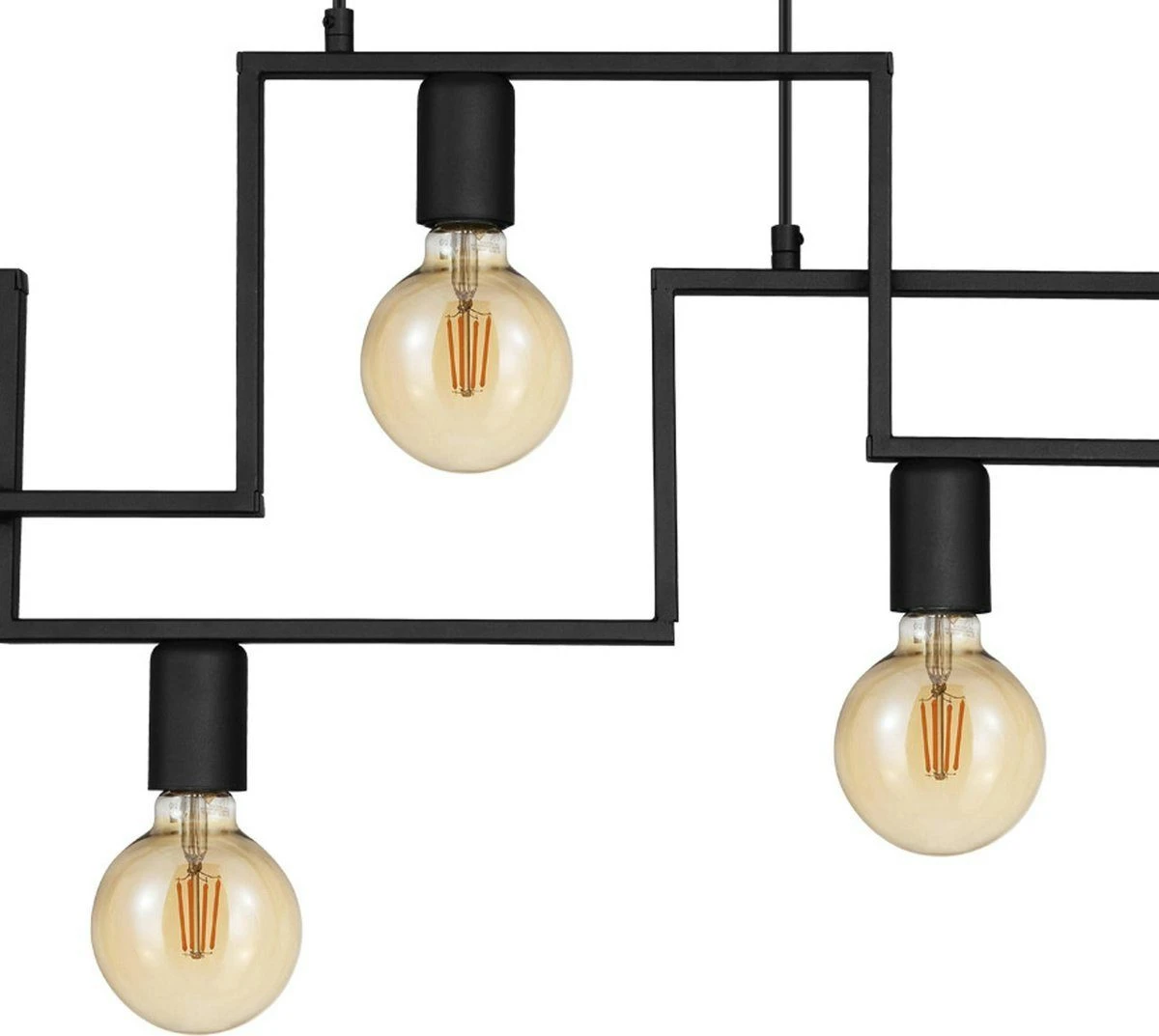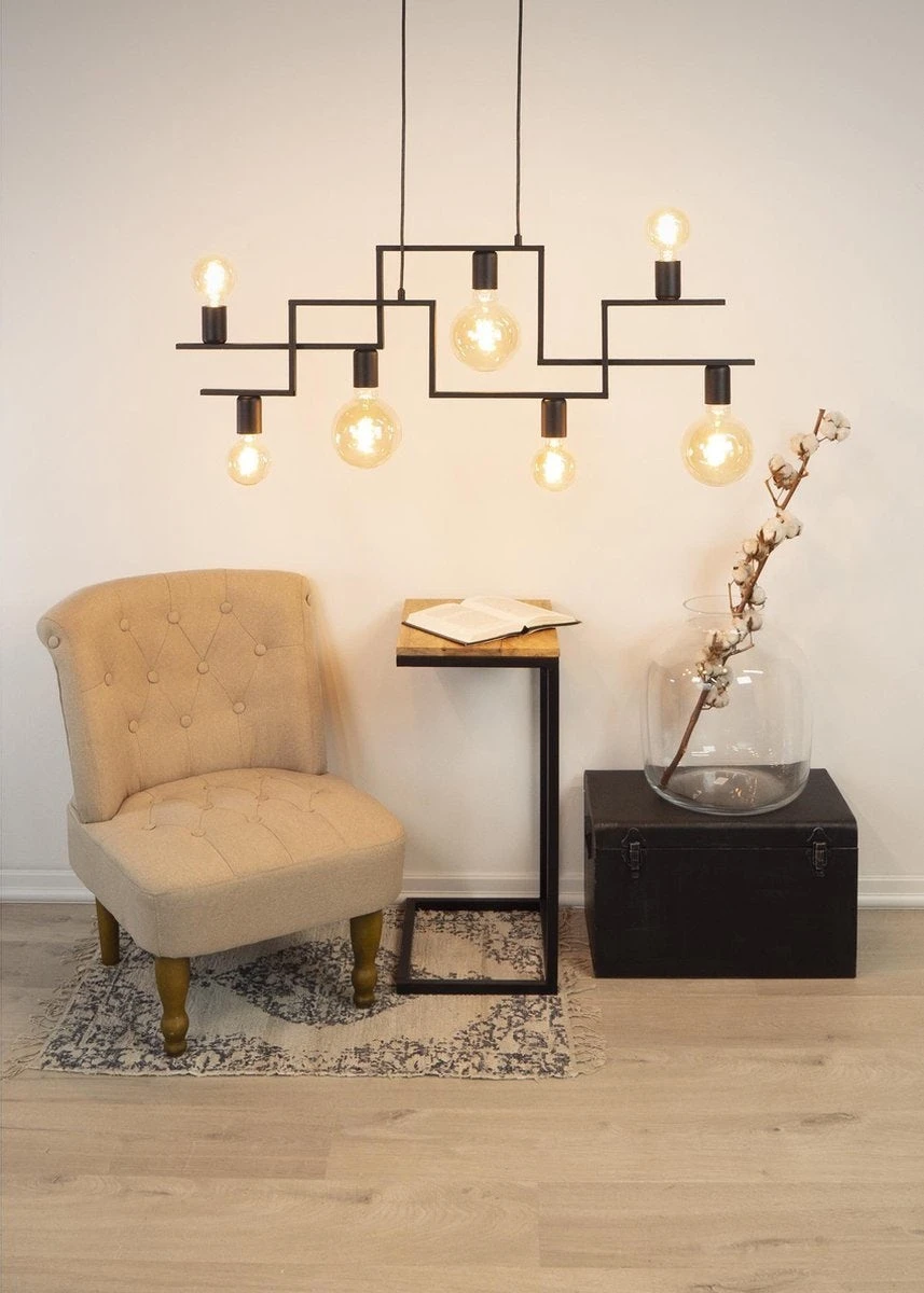 Strak vormgegeven Hanglamp met 7 E27 fittingen van maximaal 60 watt elk. Lengte 100 cm. en maximale hoogte 110 cm. Wordt geleverd exclusief lichtbronnen.