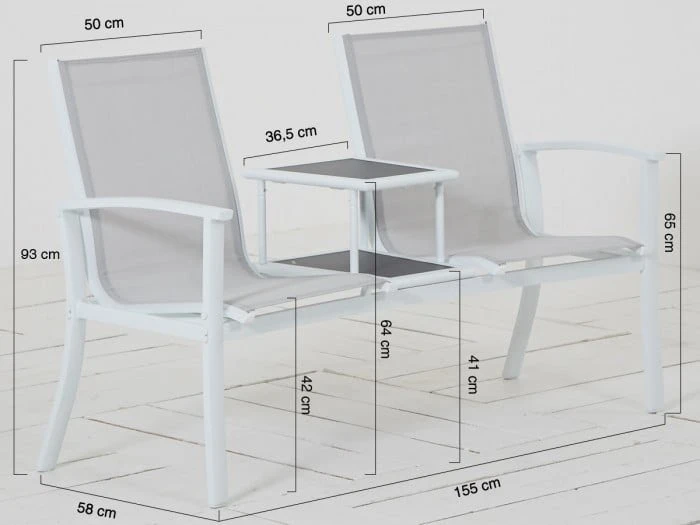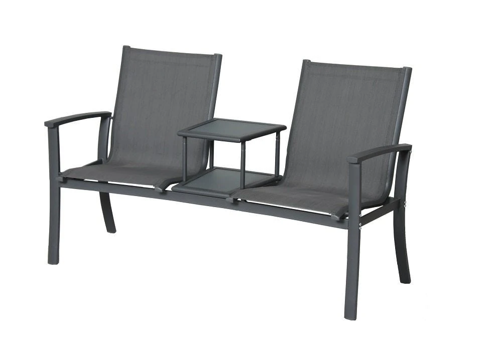 Op zoek naar een mooie tete a tete tuinbank? Deze Felix tuinbank is dan misschien wat je zoekt. De bank is onderhoudsvriendelijk door het aluminium frame en het textileen doek wat hier tussen gespannen is. Dit textileen doek geeft de bank een goed zitcomfort. Het ideale van deze tuinbank is dat je makkelijk je kopje koffie of glas neer kunt neerzetten op het tafeltje wat tussen het zitgedeelte in zit. Het tafelblad is een glasplaatje wat makkelijk schoon te houden is.