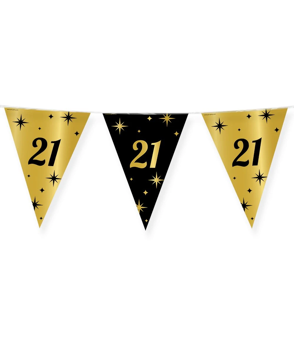 De Classy party flags 21 zijn de ideale versiering op de verjaardag van een 21-jarige. Door de kleur zwart goud en het ‘classy’ design vallen deze party vlaggen dan ook extra goed op! De aan beide kanten bedrukte vlaggetjes zijn gemaakt van folie, en hebben een lengte van 10 meter.