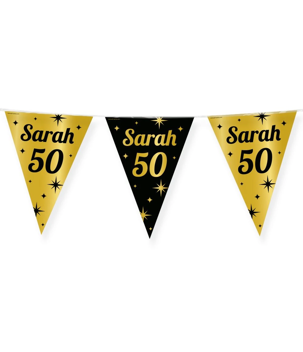 De Classy party flags sarah 50 zijn de ideale versiering op de verjaardag van een 50-jarige. Door de kleur zwart goud en het ‘classy’ design vallen deze party vlaggen dan ook extra goed op! De aan beide kanten bedrukte vlaggetjes zijn gemaakt van folie, en hebben een lengte van 10 meter