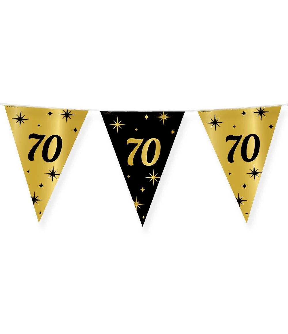De Classy party flags 70 zijn de ideale versiering op de verjaardag van een 70-jarige. Door de kleur zwart goud en het ‘classy’ design vallen deze party vlaggen dan ook extra goed op! De aan beide kanten bedrukte vlaggetjes zijn gemaakt van folie, en hebben een lengte van 10 meter.