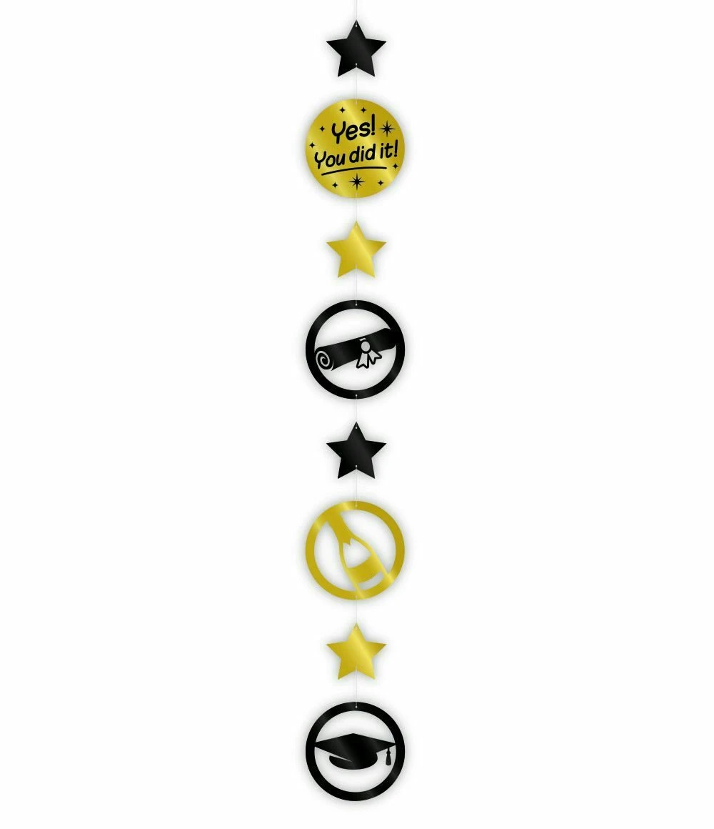 Een luxe feestje kan niet zonder deze gold/black hang decoratie en deze met opdruk You did it maakt het geslaagd feestje echt af! De hang decoratie zijn gemaakt van plastic en zijn ongeveer 120 centimeter lang.