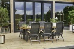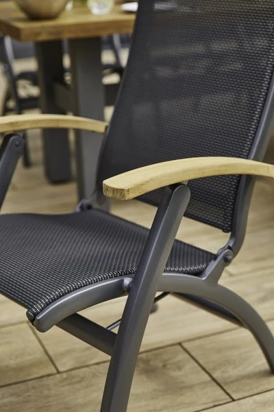 Davinci. Verstelbare stoel, aluminium met textileen en teak (FSC) armleuningen. Mooie stoel, bijvoorbeeld voor aan een teak houten tafel.