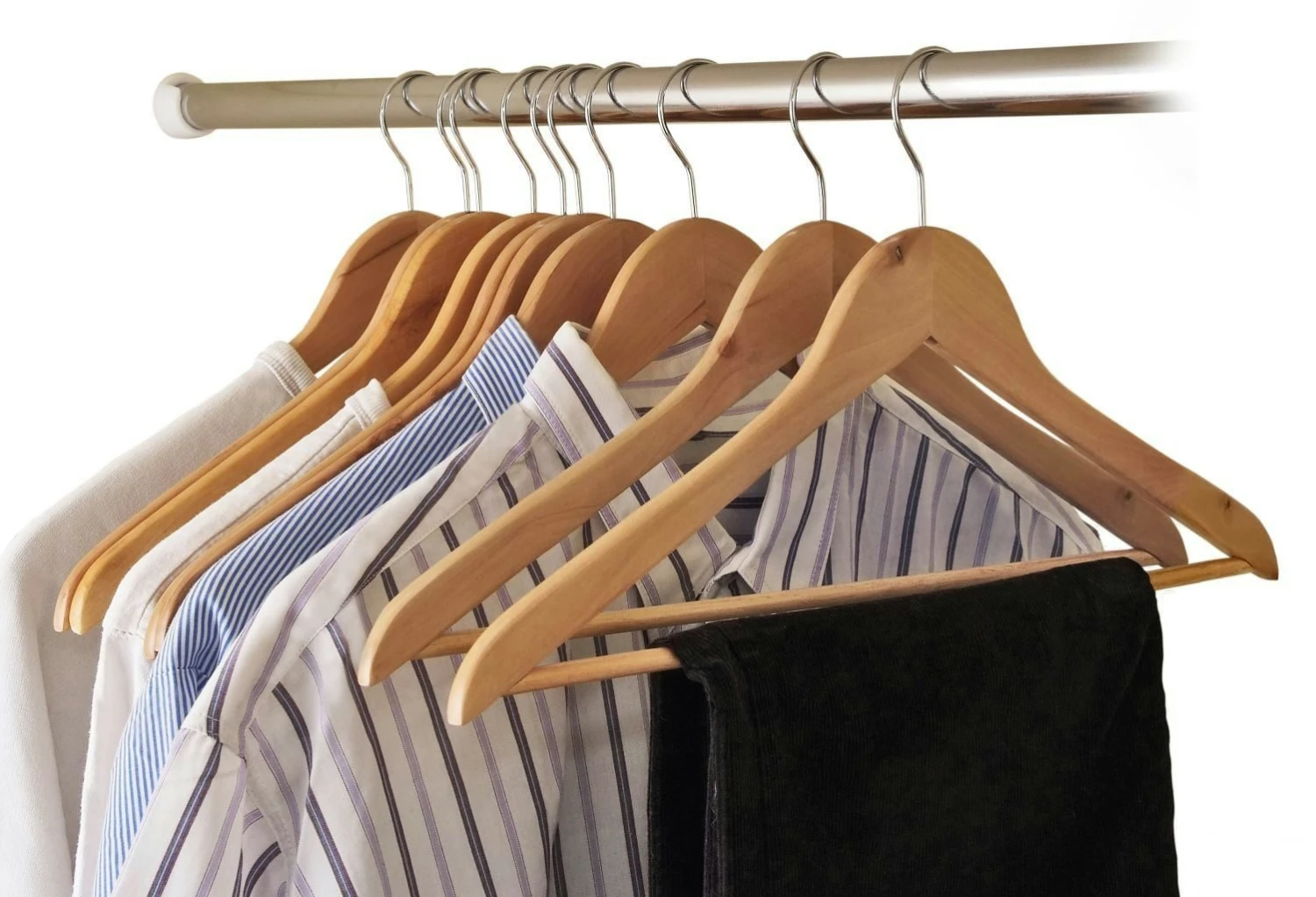 Luxe houten kledinghangers van een degelijke kwaliteit, voor het ophangen van kleding en broeken. De breedte van de hanger is 45 cm. en heeft een draaibare metalen haak.