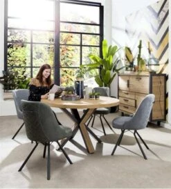 Wanneer je wat meer ruimte in de eetkamer of keuken hebt, kun je zeker de overweging maken om een ronde eetkamertafel aan te schaffen. Met een ronde eettafel zit je namelijk net iets gezelliger. De Ovada eetkamertafel uit de collectie van [email protected] is er een die gezien mag worden! Deze ronde eetkamertafel heeft een opvallende tafelpoot van hout en metaal. In combinatie met het tafelblad van warm eikenhout zorgt dit voor een mooi effect in de eetkamer. De tafel is 77 centimeter hoog en heeft een diameter van 130 centimeter. Je bestelt de Ovada eetkamertafel uiteraard bij [email protected]