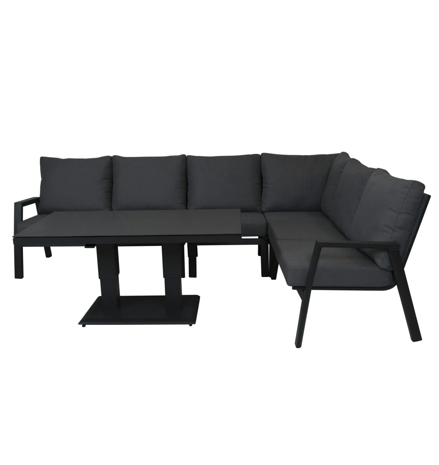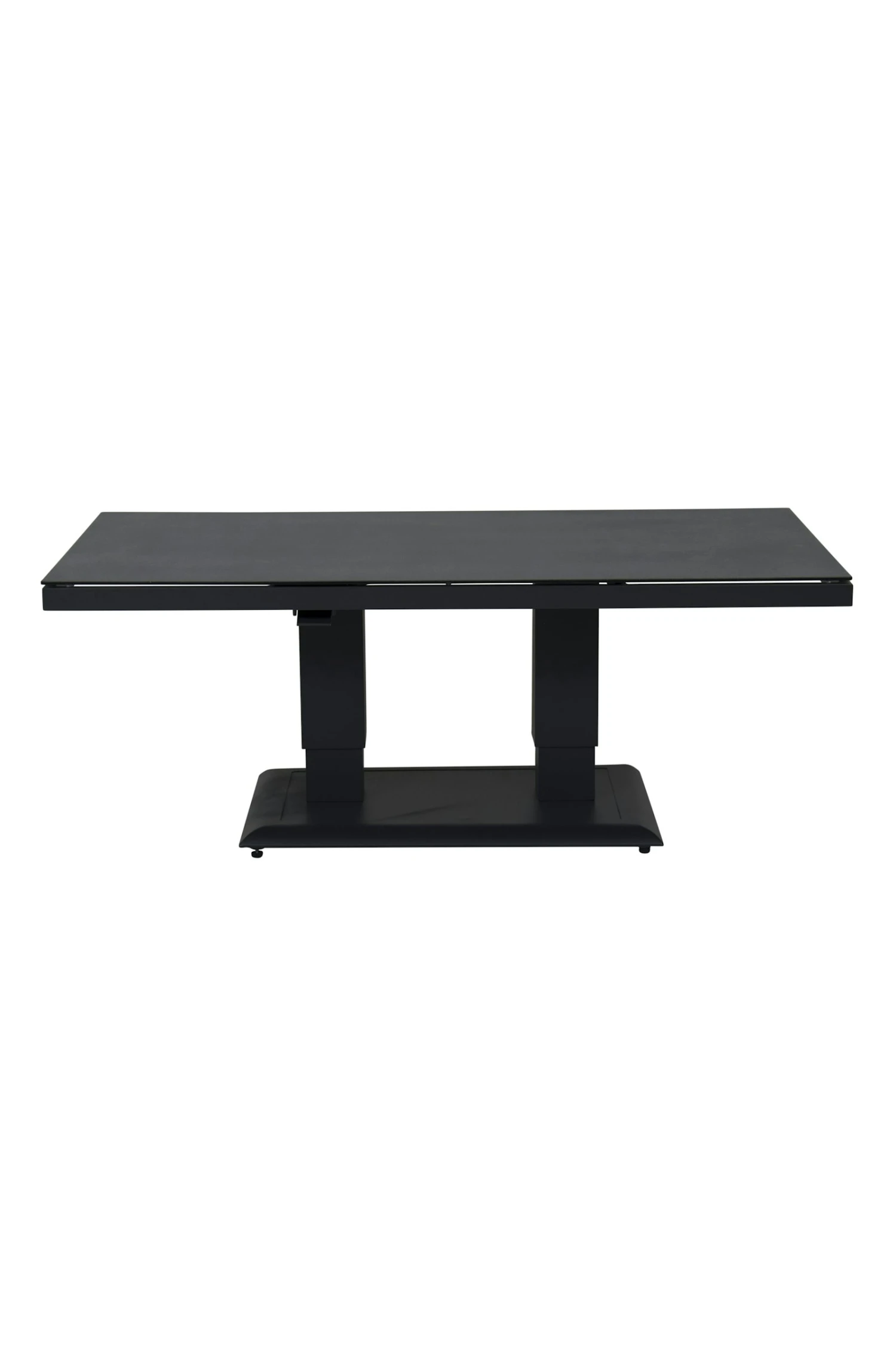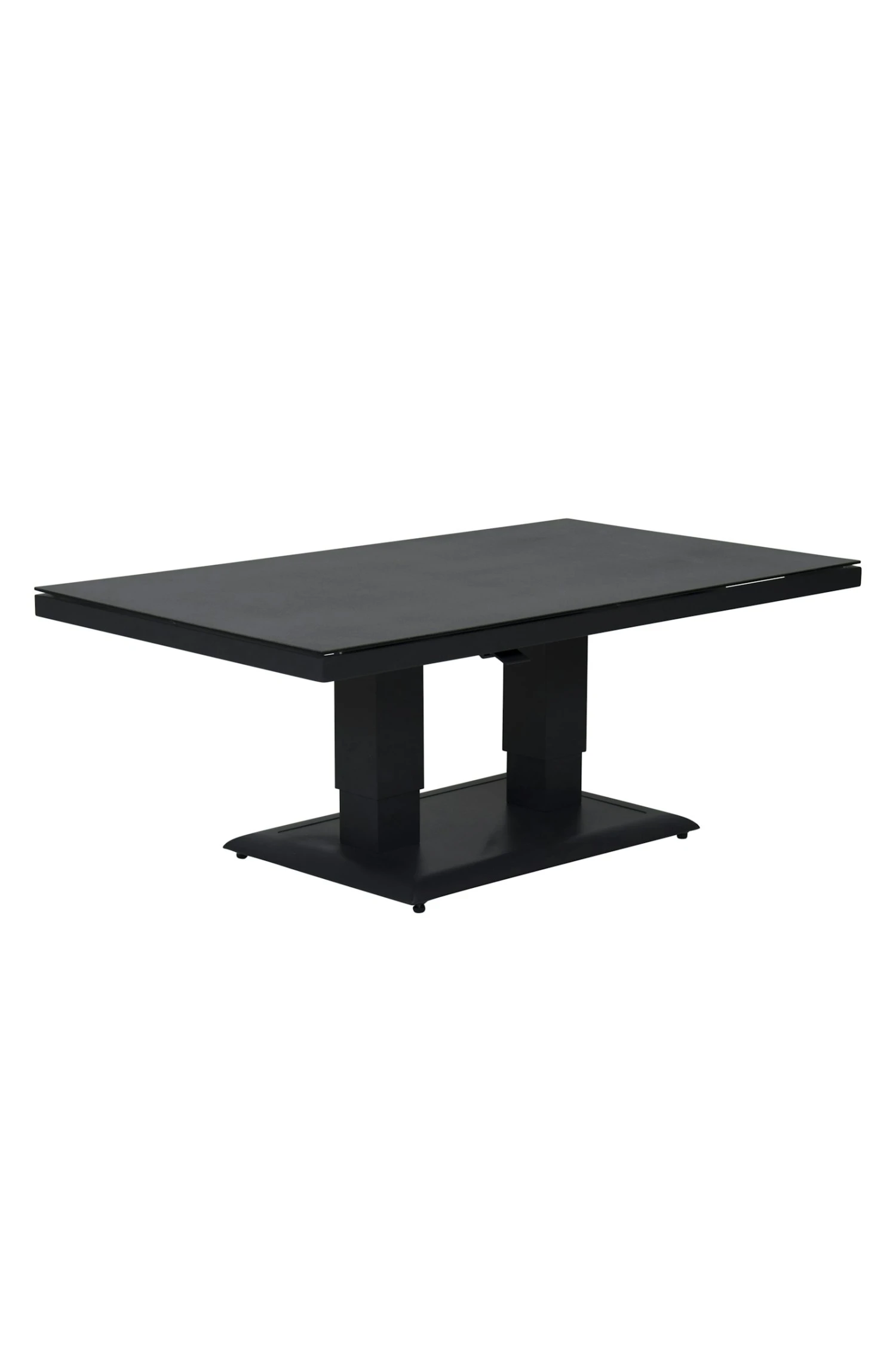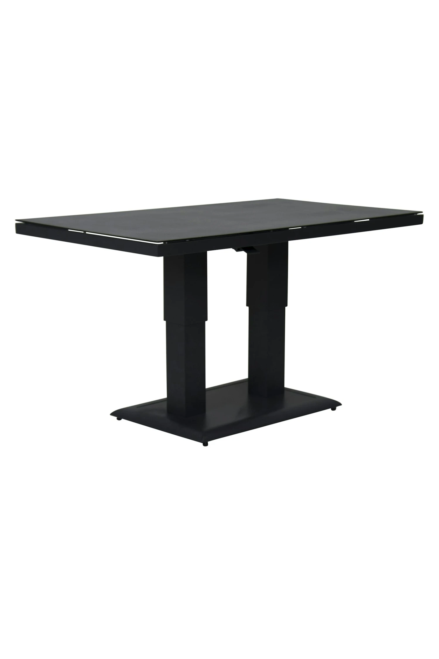 je kunt dit makkelijk door een hendel die onder het blad is gemonteerd. door het mooie strakke aluminium onderstel past de tafel bij veel stijlen van lounge meubels. het frame is mat antraciet gepoederd coat. het tafel blad 6 mm veiligheid glas met spraystone boven blad wat een natuurlijke look geeft en makkelijk in onderhoud.