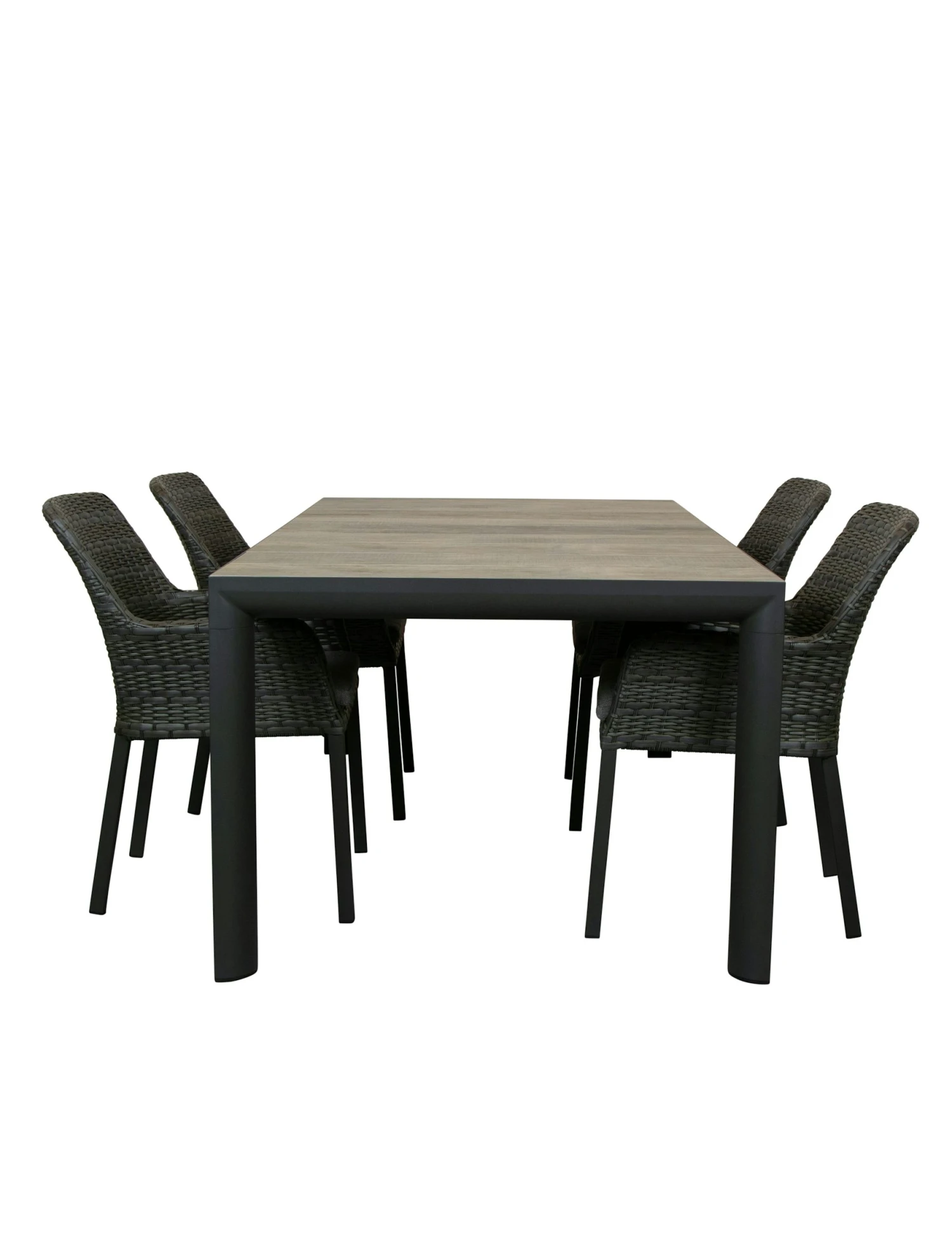 Deze Riverside dining tuinstoel is een mooie combinatie van vlechtwerk met aluminium. Het frame is van onderhoudsvriendelijk aluminium, gepoedercoat in mat royal grey. Dit past mooi bij het antraciet vlechtwerk. Het vlechtwerk heeft draden van verschillende breedtes.