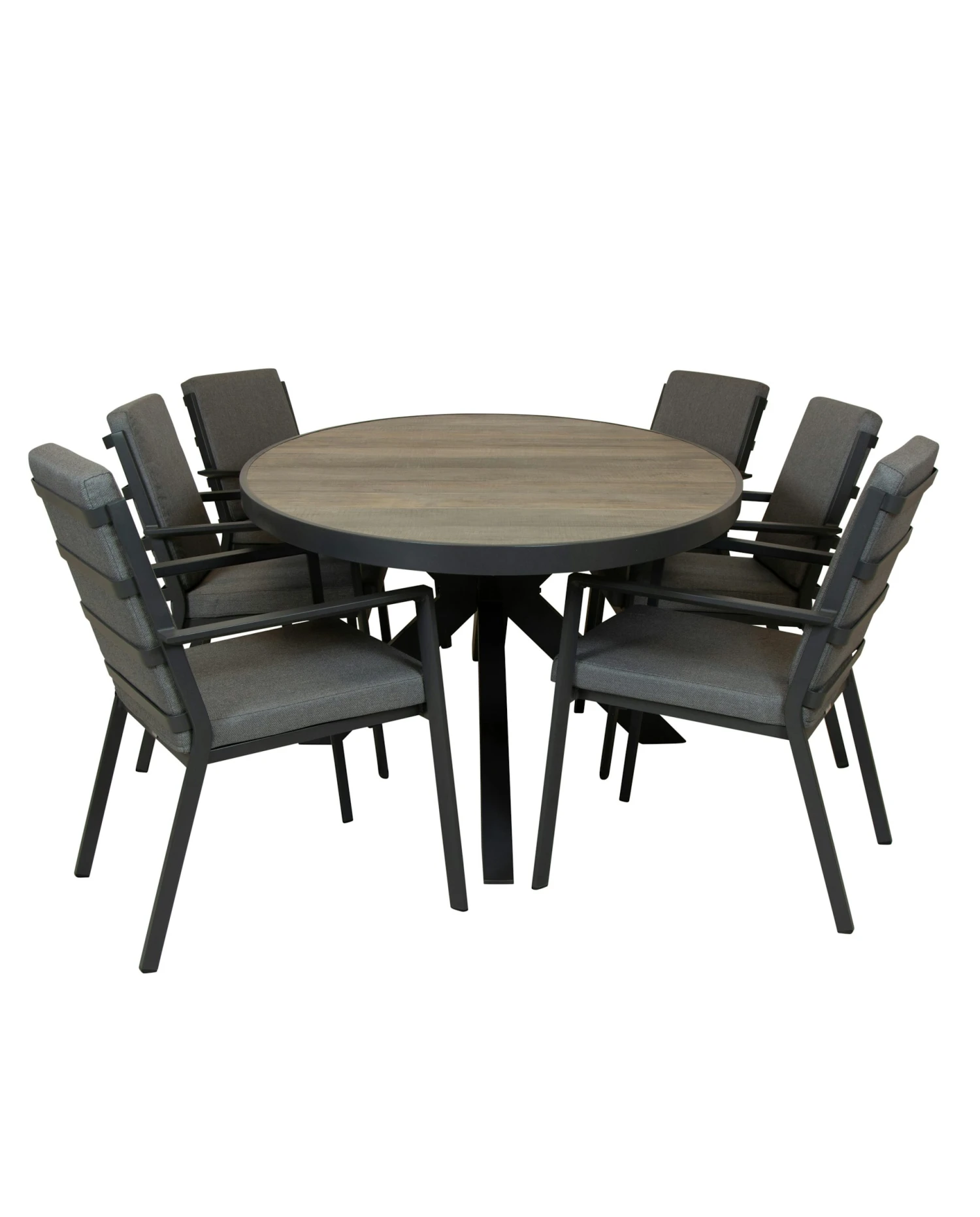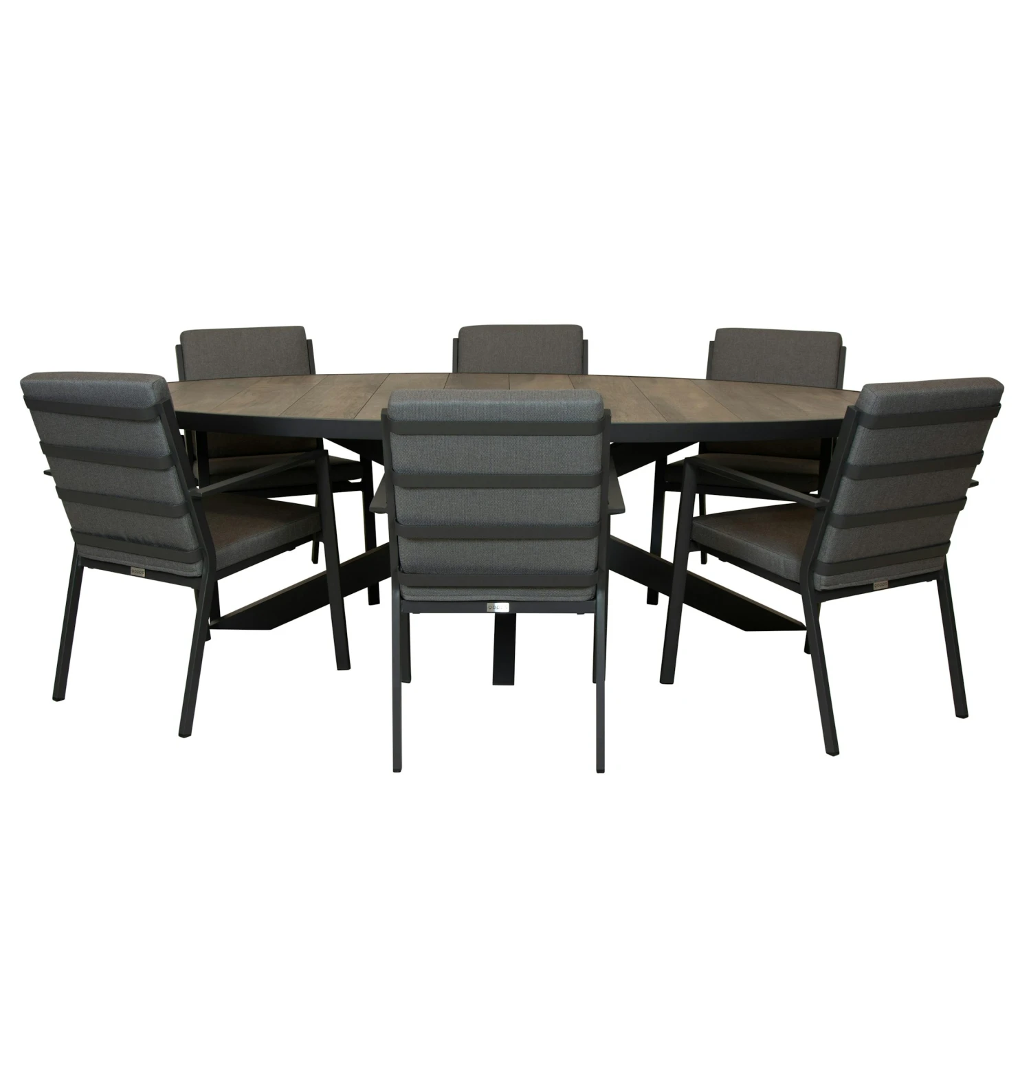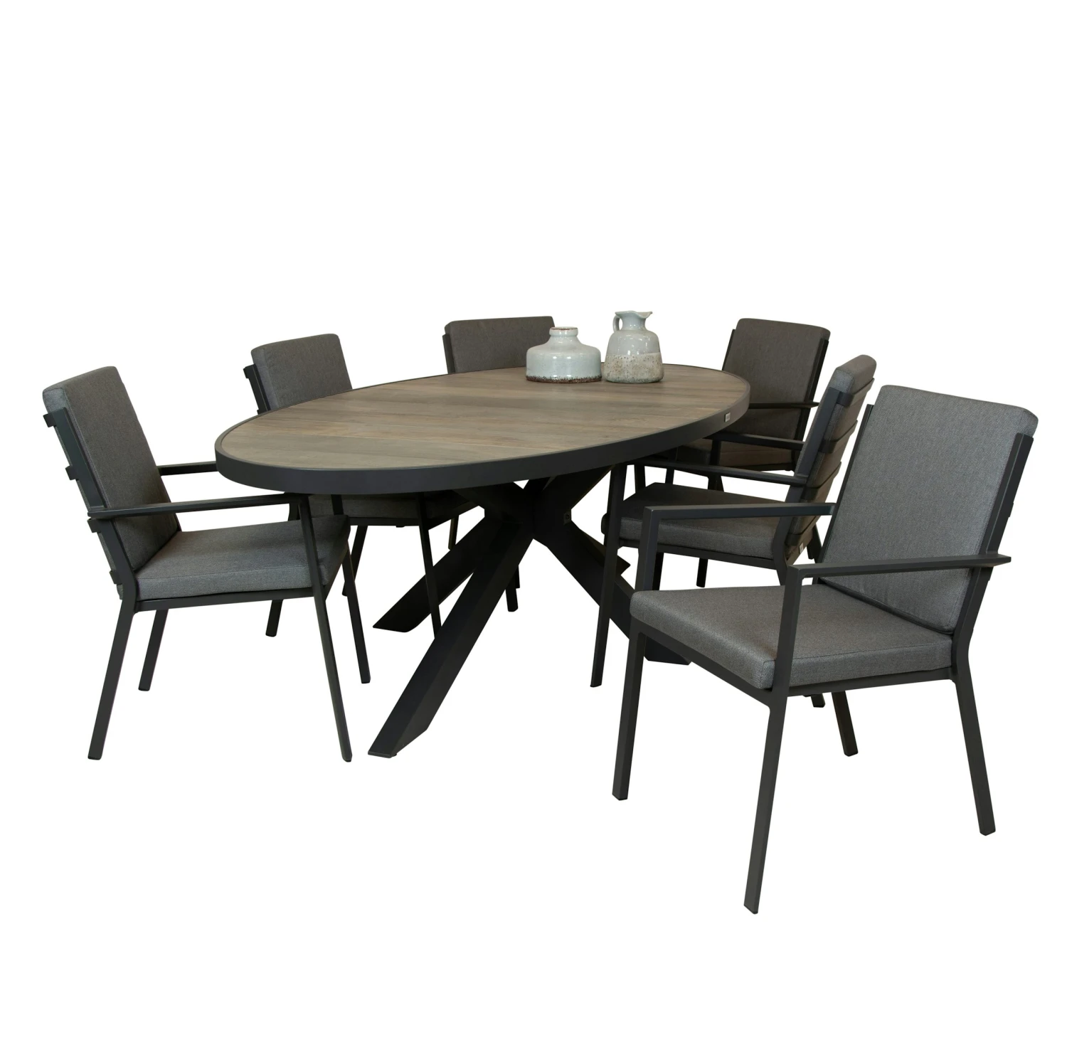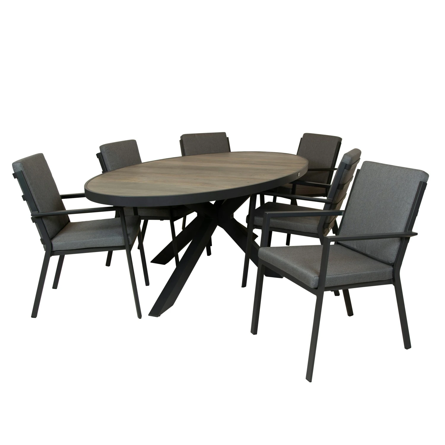 Deze ovale tuintafel heeft een kruispoot onderstel. Dit onderstel is van aluminium gepoeder coat in de kleur royal grey. Het blad is gemaakt van keramische tegel latten met een warme grijs tint en met aarde kleuren. Deze tafel past bij alle stijlen tuinstoelen en is makkelijk in onderhoud.