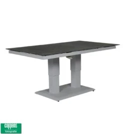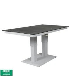 je kunt dit makkelijk door een hendel die onder het blad is gemonteerd. door het mooie strakke aluminium onderstel past de tafel bij veel stijlen van lounge meubels. het frame is mat wit gepoederd coat. het tafel blad 6 mm veiligheid glas met porselein boven blad wat een natuurlijke look geeft en makkelijk in onderhoud.