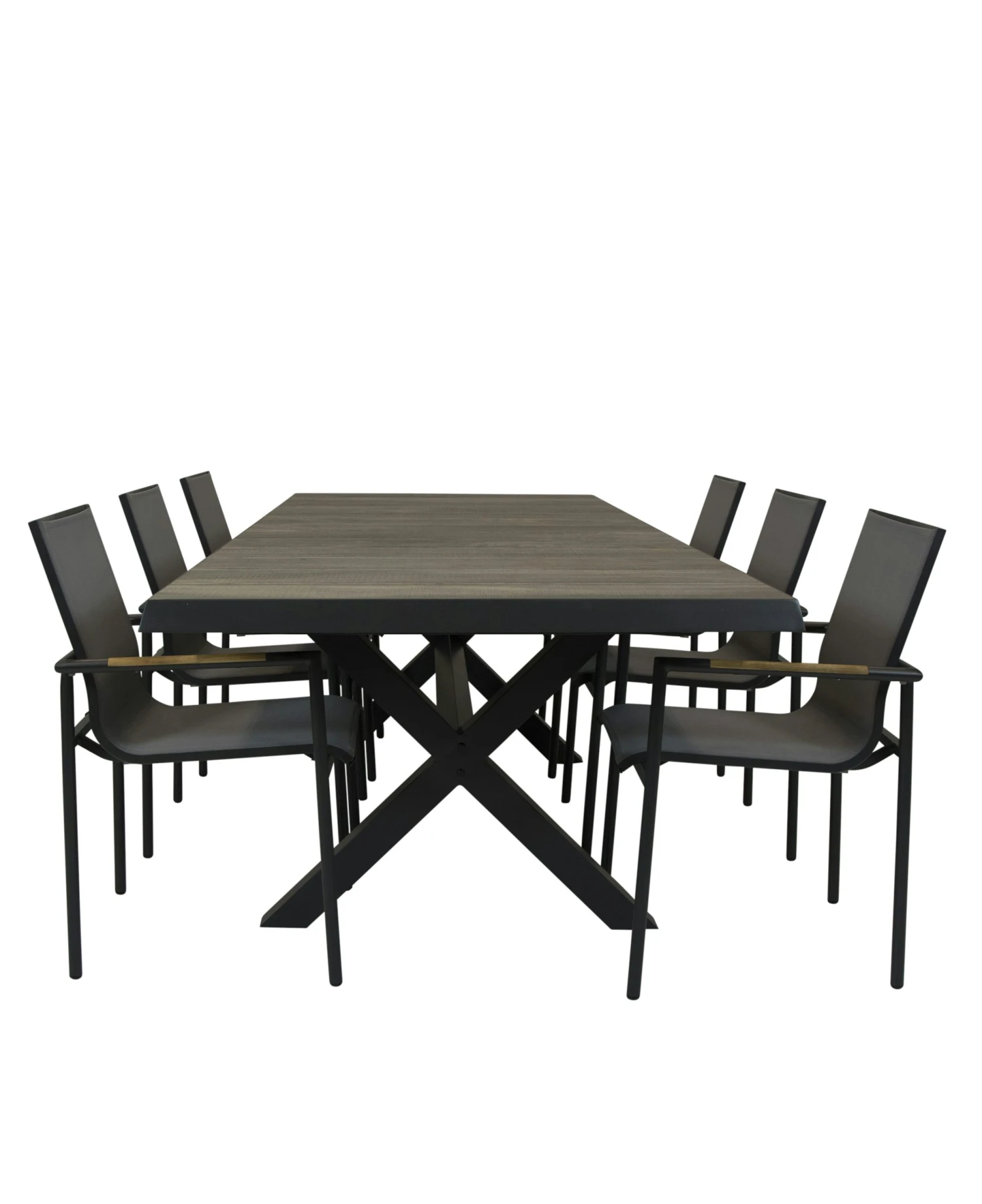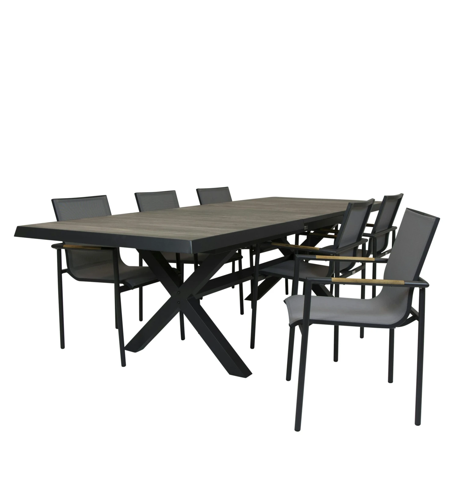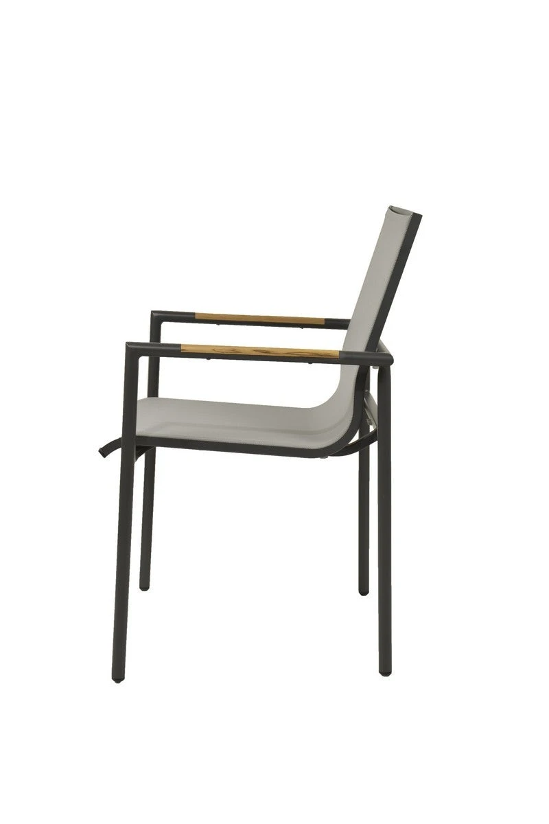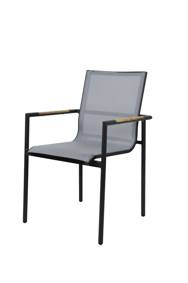 Het frame is van aluminium en is gepoederd coat in de kleur mat antraciet of terwijl royal grey. De zit en rug is van Textileen. In de armlegger is teak verwerkt. De stoelen zijn stapelbaar, je kan je gemakkelijk opbergen. Wat immers niet nodig is want de stoelen zijn zeer goed weerbestendig.