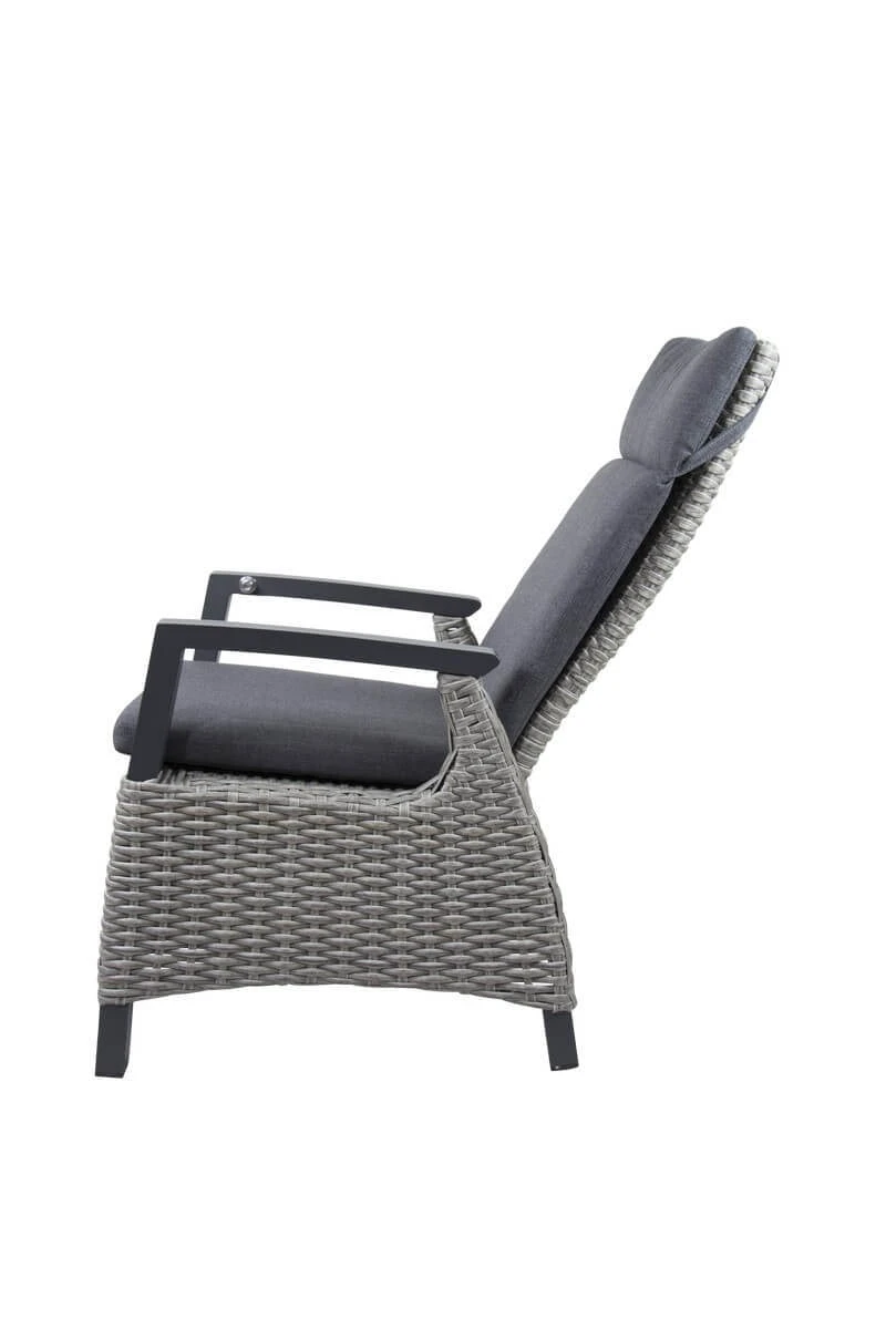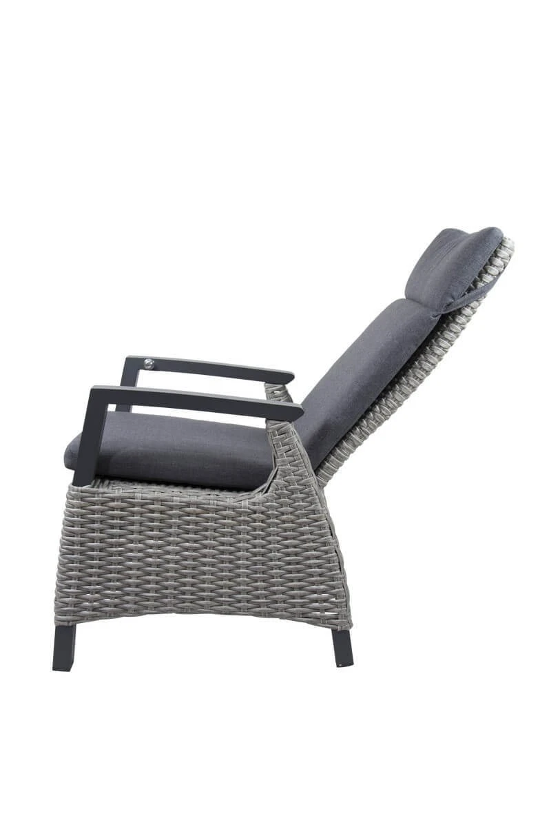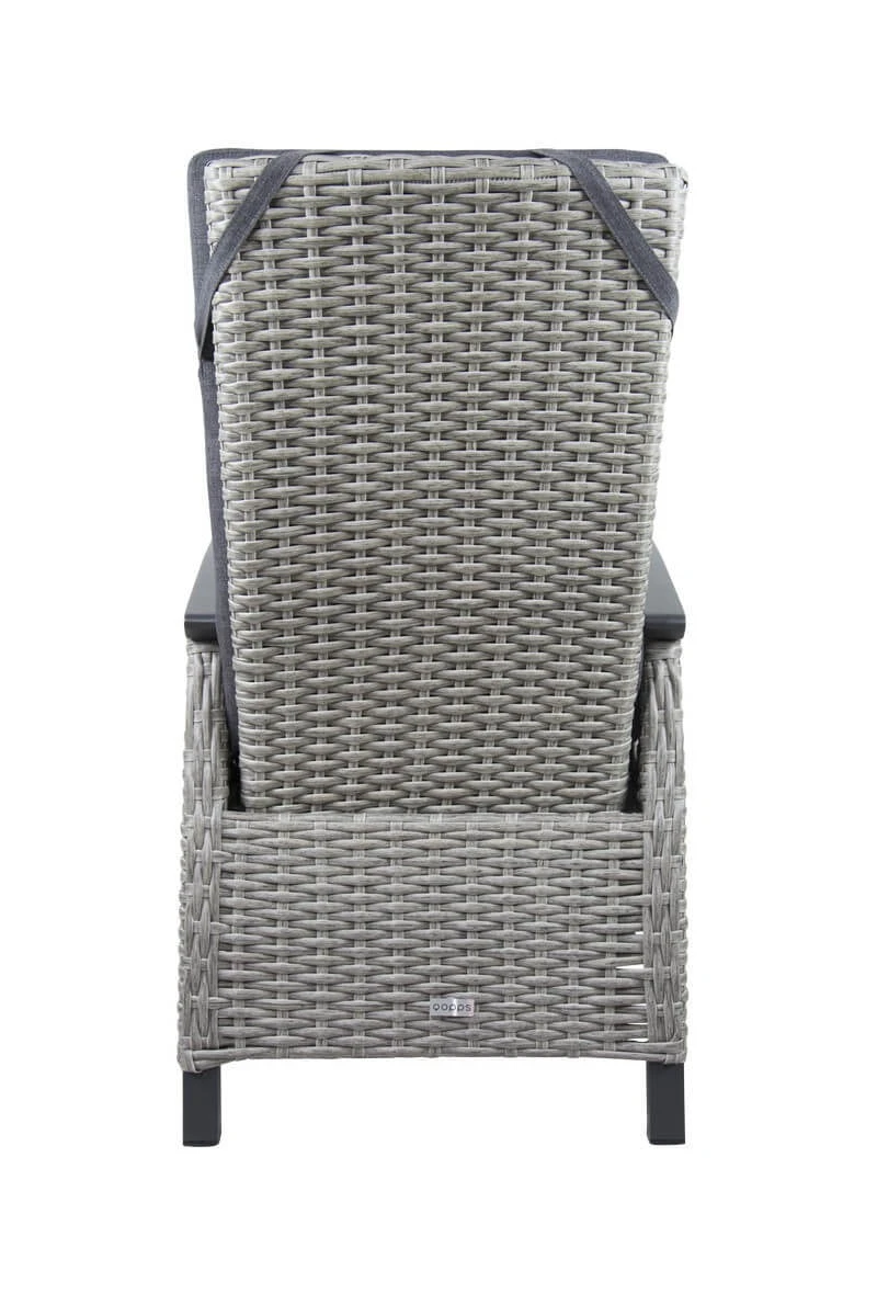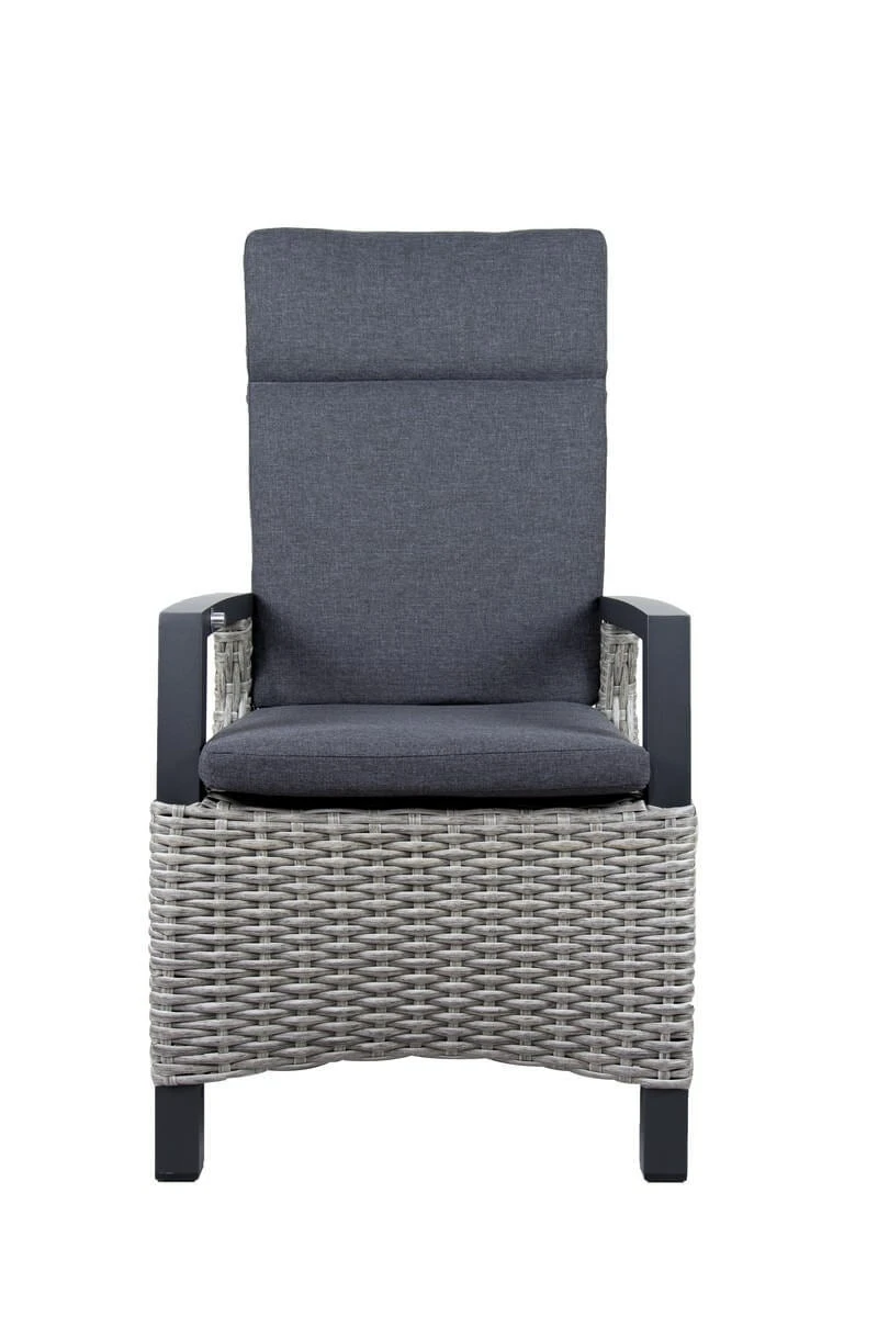 Door de combinatie van onderhoudsvriendelijke materialen is het een ideale tuinstoel. Het frame is van aluminium, wat in matt Royal grey, een mooie antracietkleur, is gepoedercoat. Het vlechtwerk, ook wel wicker genoemd, is van hoogwaardig kunststof. Deze is in een luxe cloudy grey licht grijs kleur, wat mooi bij het antraciet aluminium frame past.