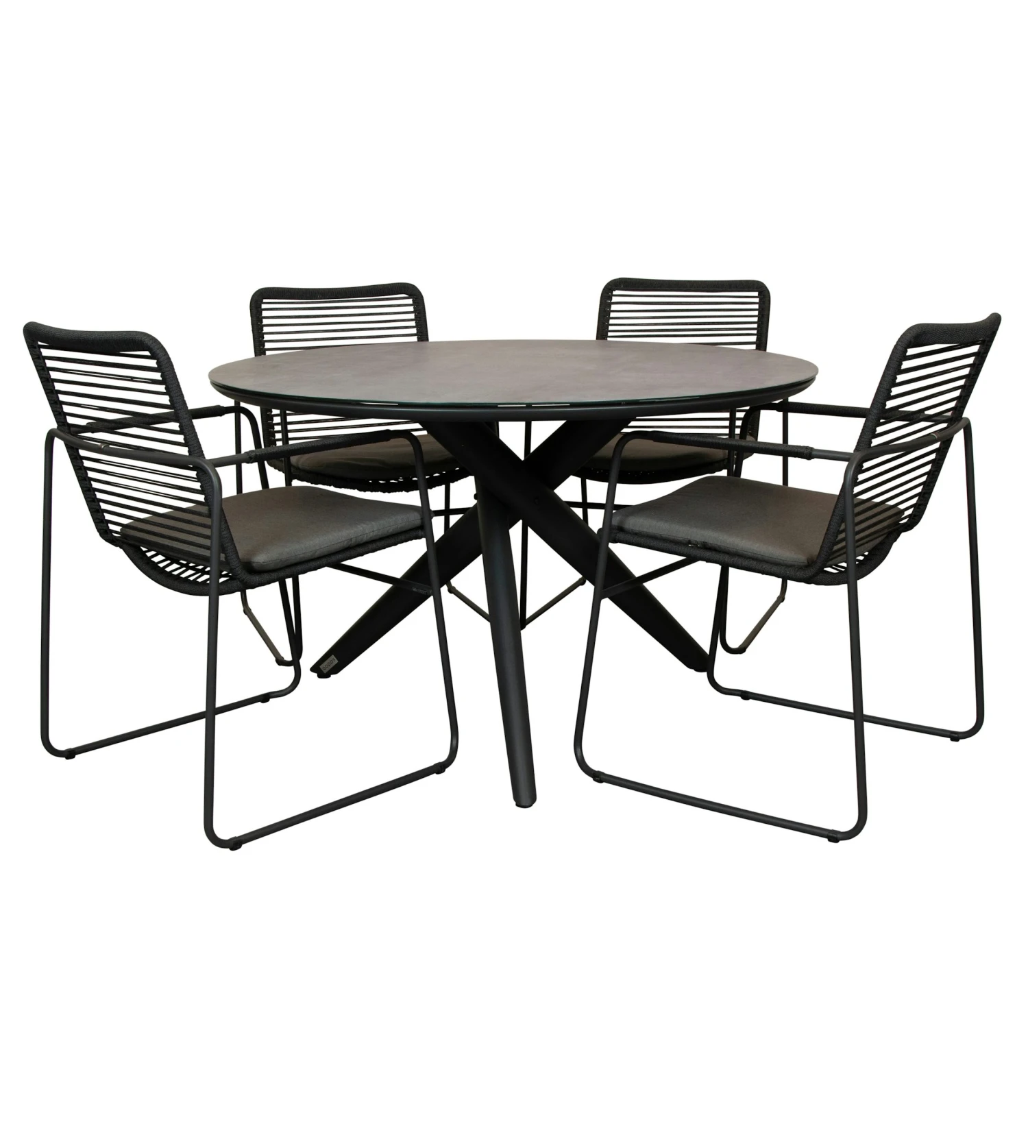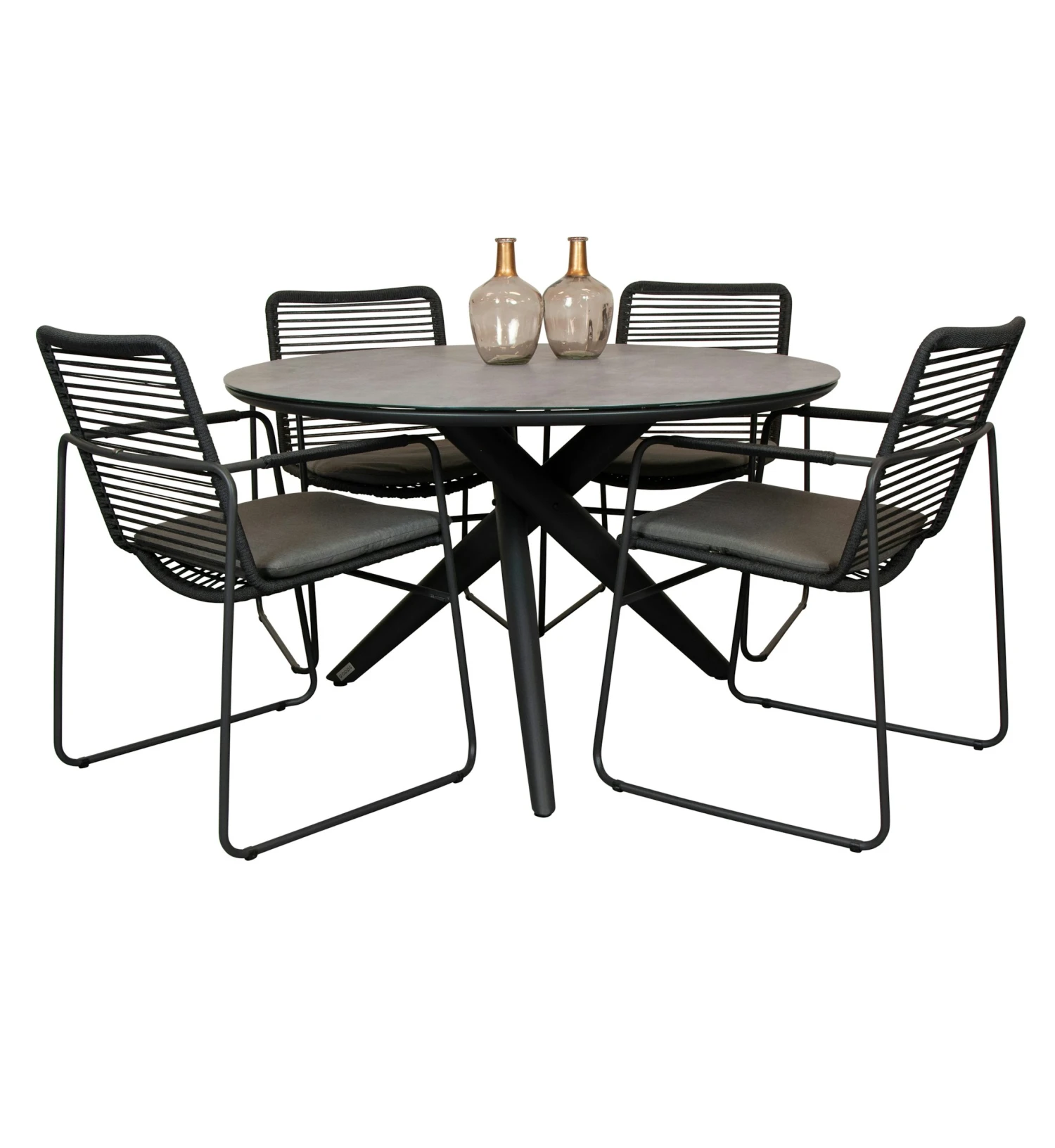 De Elba stapelbare dining stoel is vervaardigd uit een frame met een donkergrijze poedercoating. Om het frame zit een touw geknoopt wat zorgt voor een zachte uitstraling. Het voordeel van deze dining fauteuil is dat deze stapelbaar zijn, wat zorgt voor extra ruimte in de tuin of op een balkon.