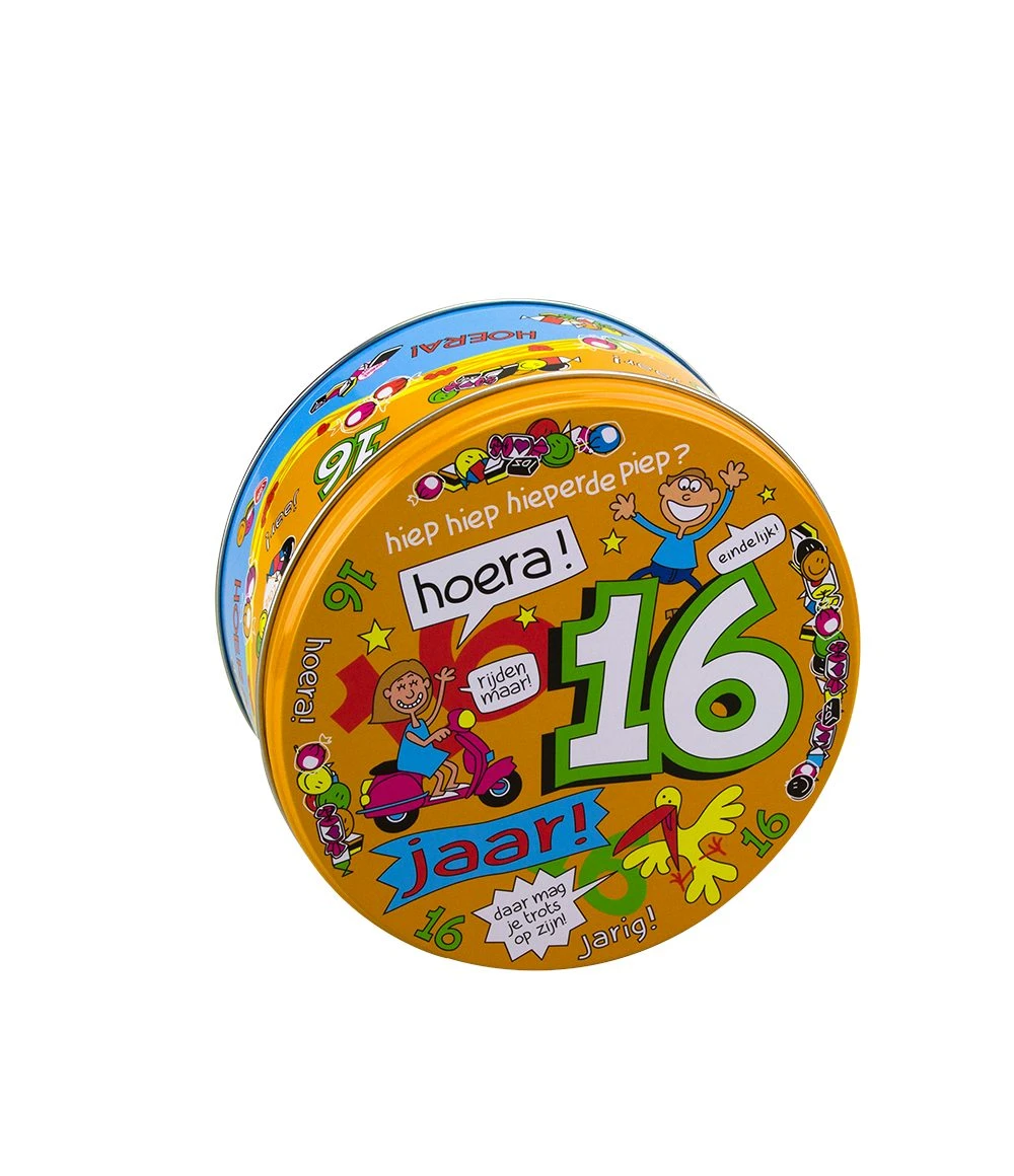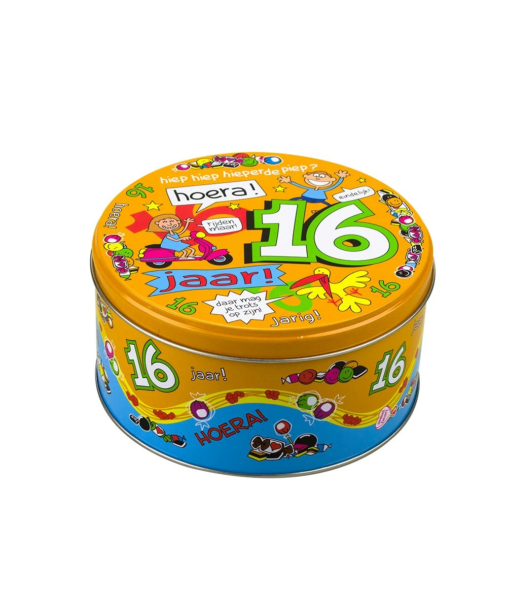 Deze grappige snoeptrommel met tekst 16 jaar is gemaakt van metaal met daarop een leuke cartoontekening.