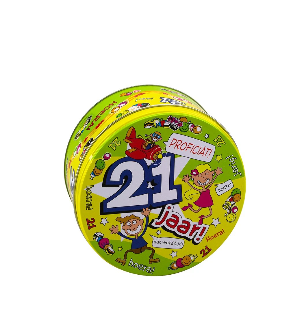 Deze grappige snoeptrommel met tekst 21 jaar is gemaakt van metaal met daarop een leuke cartoontekening.