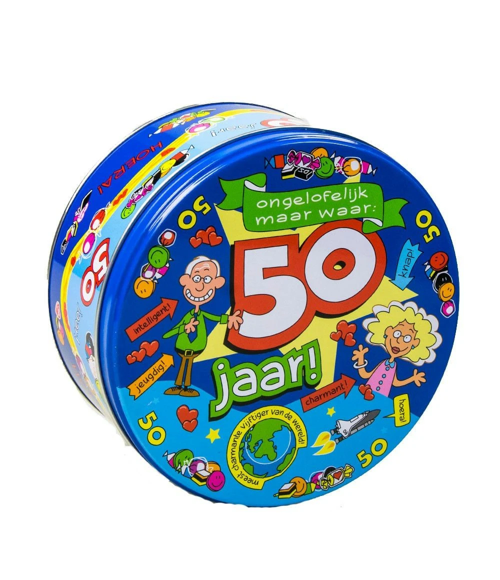 Deze grappige snoepblik met tekst 50 jaar is gemaakt van ijzer met daarop een leuke tekening.