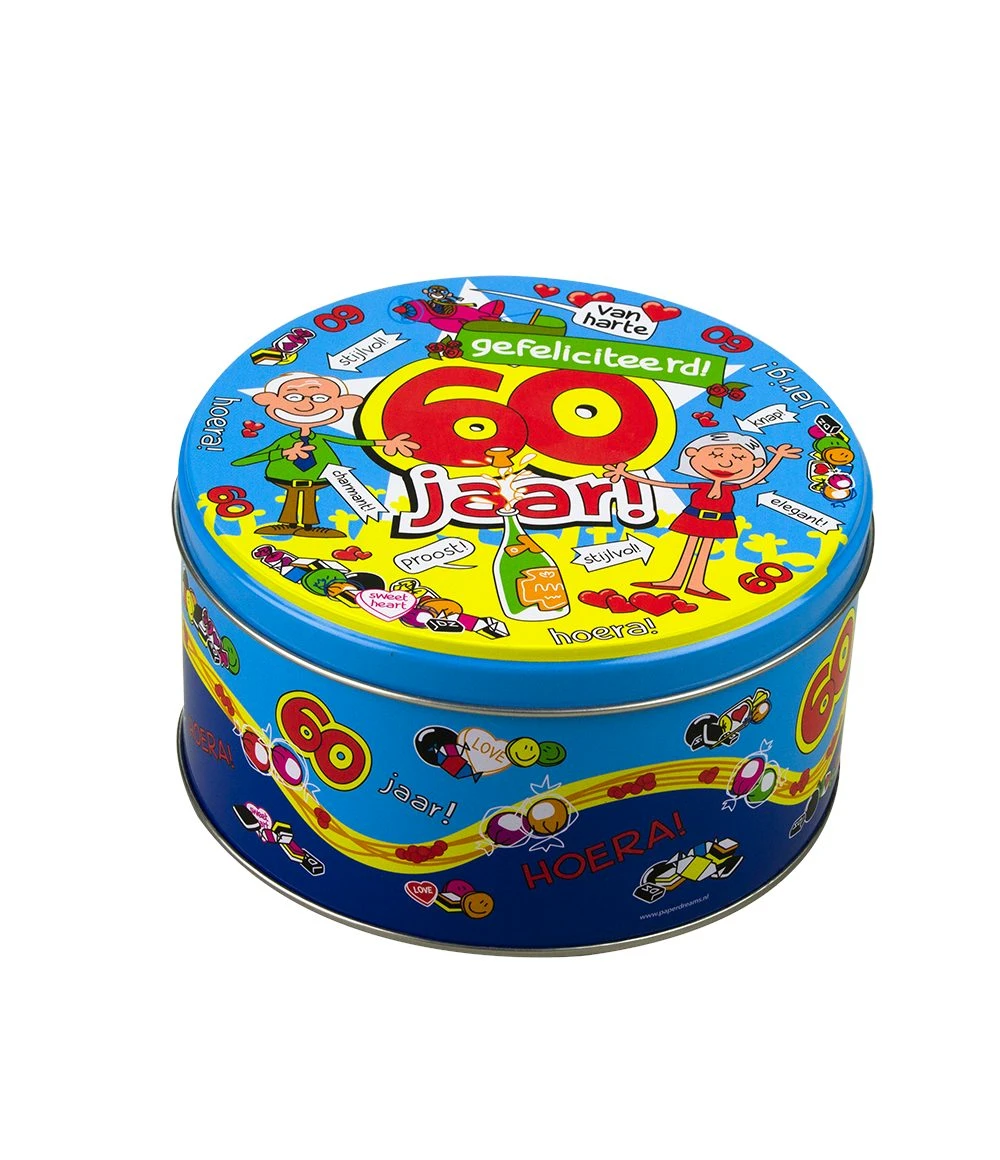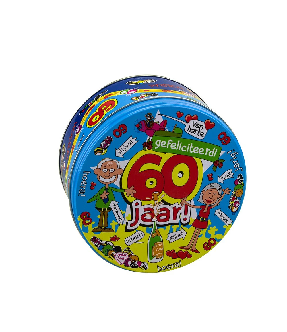 Deze grappige snoeptrommel met tekst 60 jaar is gemaakt van metaal met daarop een leuke cartoontekening.