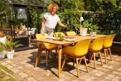 Deze Sophie Studio Curry Yellow-teak tuinstoel Organic van Hartman is uitgevoerd met een teak onderstel en een hoogwaardig kunststof kuip in de kleur Curry Yellow. Door dit onderstel is deze stoel erg goed te combineren met teak tafels. Bij het ontwerp van deze stoel heeft men de armlegger weggelaten, dit zorgt voor een slanker design van de stoel. De kuip van deze stoel is ontwikkeld met de Curved Technology waardoor de stoel een uitstekend zitcomfort heeft. De Sophie Studio tuinstoel is weerbestendig en kleurvast. Dit is een stoel waar u jaren van kunt genieten.