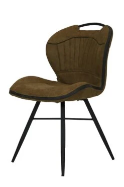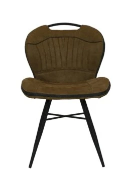Stoel Splash heeft een handige handgreep in de rug en een stevig zwart metalen onderstel. Leverbaar in de kleuren: liver, cognac en moss.