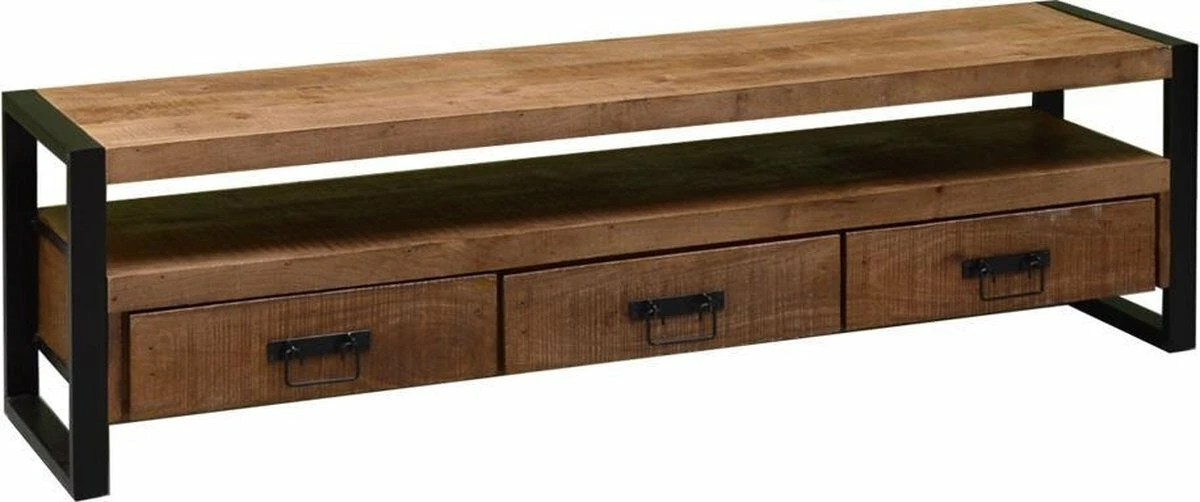 Industrieel lowboard uit het programma Strong. Uitgevoerd in naturel Mango en zwart metalen poten. Afmetingen 60 x 150 x 45 cm. ( H x B x D ). Ook leverbaar met 2 laden en een breedte van 102 cm.